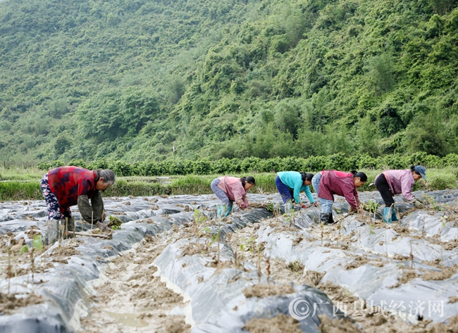 4月26日,在融安县泗顶镇振彩村板坪屯金丝皇菊产业园,当地群众正在种植菊花。(韦荣军 摄)