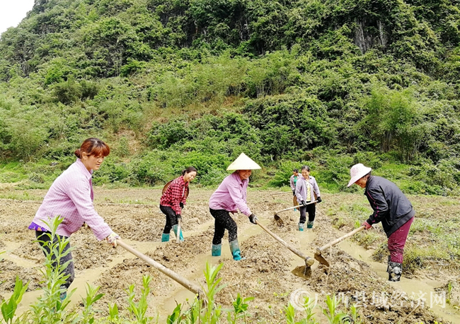 4月26日,在融安县泗顶镇振彩村板坪屯金丝皇菊产业园,当地群众正在挖土打壕沟。(刘泽良 摄)