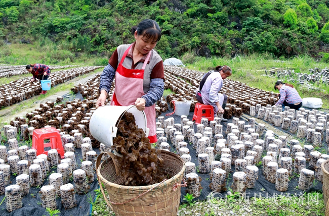 4月26日,走进位于南丹县芒场者麻村的黑木耳种植示范基地,一片忙碌,村民们正忙着采摘鲜木耳,“今年我们合作社发展种植黑木耳有6亩,长势很好的,现在正在采收第二批啦!”同富食用菌合作社社员黎承德一边采摘黑木耳,一边乐呵呵地说。 据了解,同富食用菌合作社共有35户农户,其中贫困户就有26户,预计6亩产值达23万元,带动就业18 人。