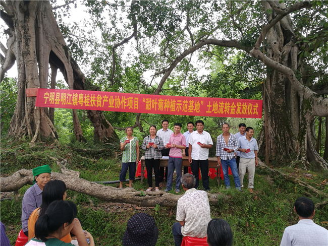 近日,明江镇在洞廊村独木成林举行粤桂扶贫产业协作项目“甜叶菊种植示范基地”土地流转金发放仪式,为191户贫困户群众发放流转金85万元。近年来,明江镇大力推进粤桂扶贫产业协作项目,该基地种植面积500多亩,直接受益贫困户群众369户1527人,惠及贫困地区人口6154人。