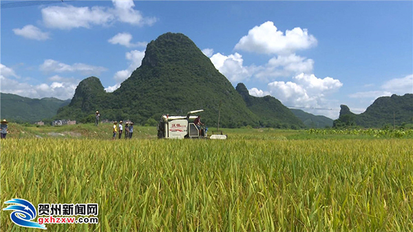 当下,正值早稻收割的时节,在钟山县公安镇的万亩早稻基地,记者看到,收割机在不停的忙碌着,成熟的稻谷在烈日的照射下显得金光灿灿。公安镇荷塘村委白霞街的贫困户陈土帮,趁着晴好天气,全力抢收水稻。今年,他加入了有机水稻种植合作社,订单种植了6亩水稻,每亩获得了800元的产业奖补资金。