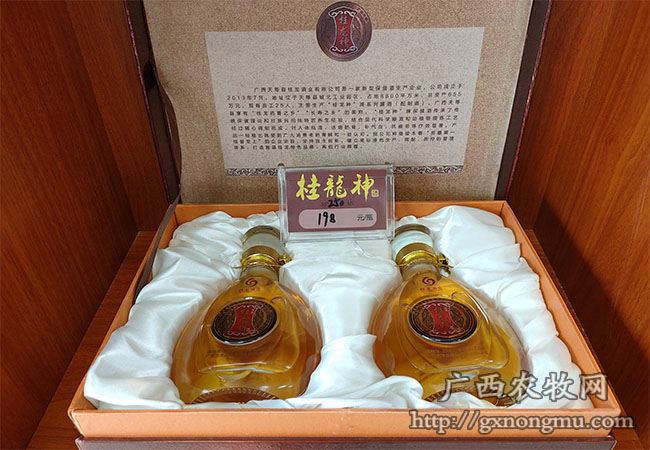 “桂龙神”牌系列酒始终坚守工匠精神,追求卓越品质。该公司生产的“桂龙神”牌系列酒,得益于广西天等县荣获的“中国长寿之乡”美称,继承和发扬了传统养生保健理论及传承了少数民间独特的养生保健经验,采用现代科学酿酒和动植物提炼技术精心调制。所泡制的“桂龙神”牌系列酒,以纯正高度米酒为基础,从闻名全国的“桂龙药膏”秘方中进一步精选本地天然中草药为药料,严格泡酒配比,合理控制温湿度,浸泡于密封老坛,根据春夏秋冬气候之别,核定浸泡时间,而后经露酒生产程序严密配制而成。桂龙神酒经过3年以上的长时间浸泡,酒与药材完成了高度的融合,酒液色泽金碧透亮,喝起来酒味醇厚浓郁、米香十足,口感上甘甜延绵、平和净爽,闻起来还带有一股独特的淡淡药材香味,为优质养生露酒。