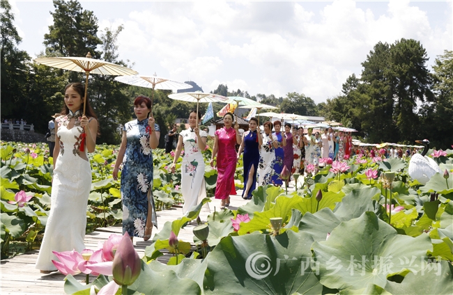 8月7日,南丹县巴平荷花文化旅游节在该县芒场镇巴平村下街屯开幕。近万名游客前来观赏盛夏荷花的风姿,欣赏精彩的旗袍秀和歌舞表演,品尝当地特色美食,体验美丽乡村风情。