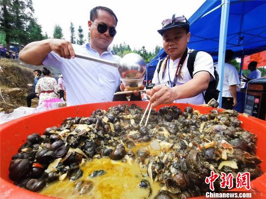 10月11日, 广西柳州市融水苗族自治县拱洞乡养殖的6000亩螺蛳获得丰收,拱洞乡高武村举行 “香螺美食节”,并在田边烹制螺蛳美食,吸引上千名当地民众和游客前来“吸螺”。螺蛳是螺蛳粉的重要原料,螺蛳粉产业的火爆让螺蛳养殖成为当地重要的扶贫产业,仅拱洞乡就有贫困户1673户参与田螺养殖。