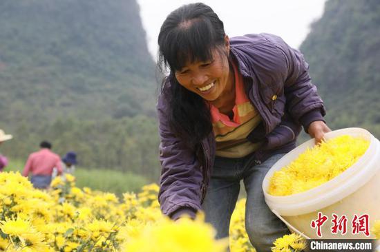农民在采摘菊花。 韦露 摄