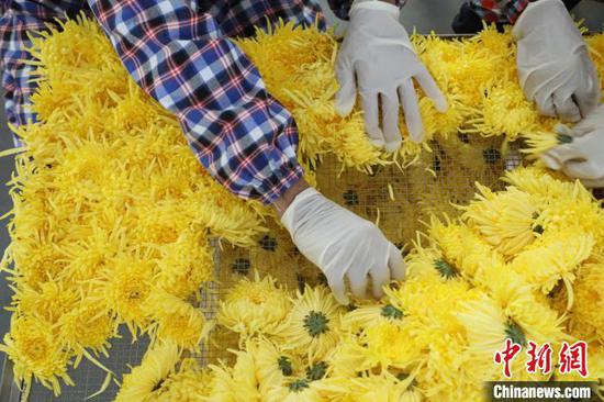 农民在将菊花摆放平整。韦露 摄