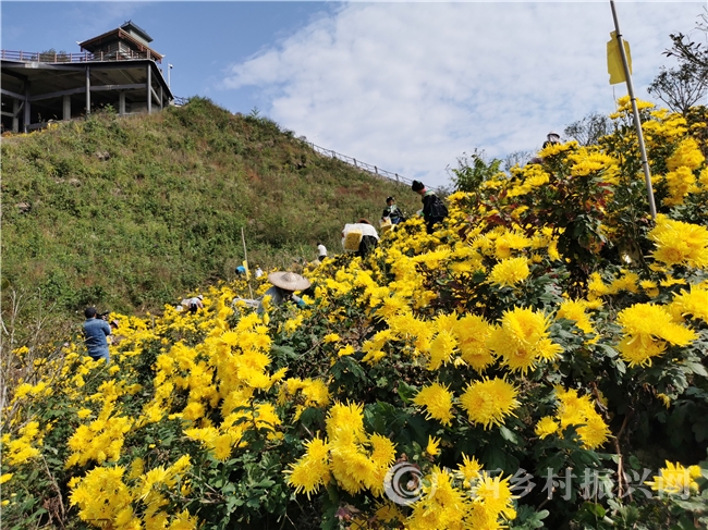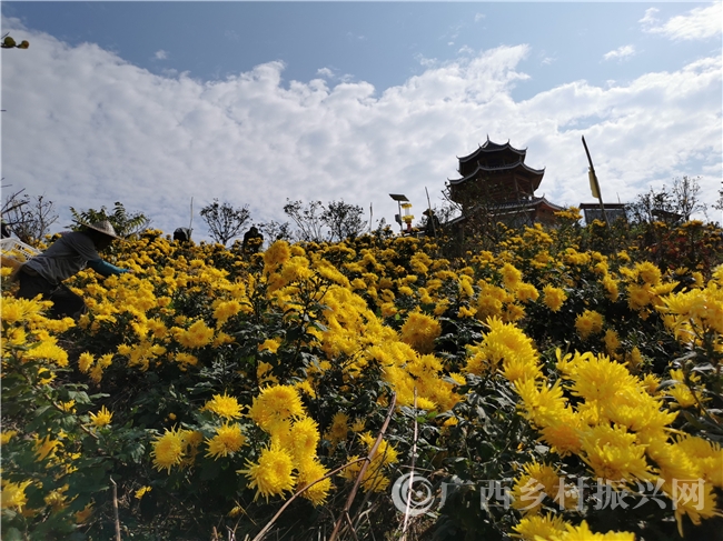 芳菊开林耀,青松冠岩列。近日,在环江毛南族自治县大沙坡万亩现代特色林业扶贫产业园里,漫山遍野的菊花在阳光的照耀下金灿灿、黄澄澄的,吸引了众多前来观赏的游客,采收的村民们也在众花中来回穿梭着赶忙采摘。