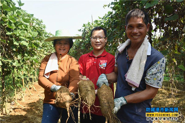 11月12日,在东兴市东兴镇河洲村,脱贫户黄福武夫妇和第一书记唐上东一起捧起刚收获的葛根。