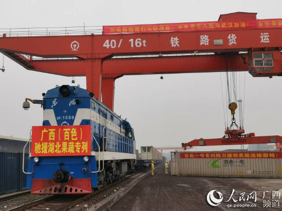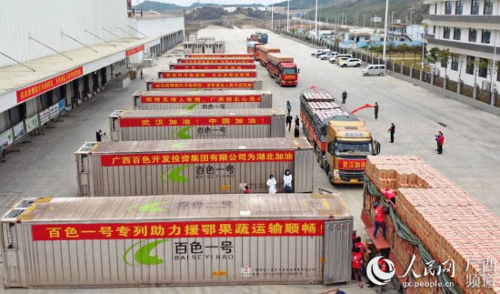 “驰援湖北!武汉加油!”2月11日上午,广西桂西儿女接棒吹响驰援湖北果蔬物资集结号,广西支援湖北果蔬物资直达冷链专列从位于革命老区百色的百色火车东站启程,直发湖北宜昌市。这是继2月7日广西开行第三班支援湖北果蔬物资直达冷链专列后,时隔4天开行的第四班专列,也是首次由百色一号冷链专列承运、首次从革命老区百色开行支援湖北果蔬物资直达冷链专列,也是百色市发挥“南菜北运”基地优势,继1月30日组织驰援武汉之后,第二次组织优质果蔬支援湖北抗击疫情。