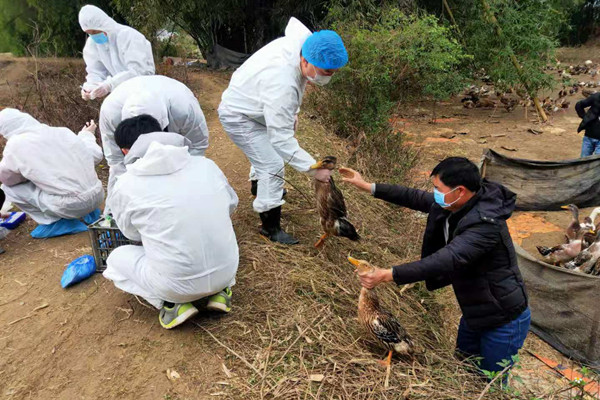 钟山县深入贯彻落实习近平总书记关于做好新型冠状病毒感染肺炎疫情防控和保障蔬菜等“菜篮子”产品供应的重要指示精神,农业党员干部深入农村一线统筹抓好畜禽水产生产技术精准指导,扎实做好“菜篮子”农产品市场供应产销衔接,毫不松懈抓好重大动物疫病防控措施在农村落实。图为2月11日,县动物疫病防控党员干部深入准备外调的回龙镇回龙村董明贤鸭场开展采样监测场景。
