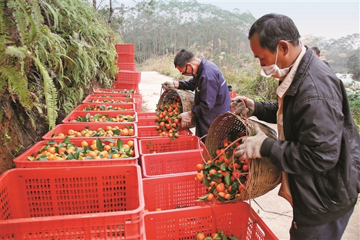 2月13日,平南县镇隆镇平安村湖南塘屯村民在果场收果。 莫新雄/摄