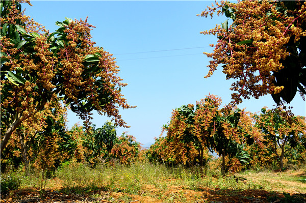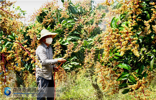 3月8日,在右江区永乐镇南乐村的芒果地里,一名果农在给芒果花喷洒农药。
