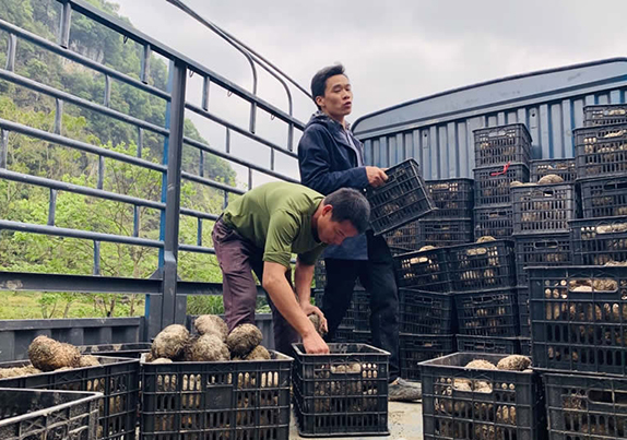 日前,一阵阵喧闹声打破了环江毛南族自治县明伦镇合狂村平门屯往日的宁静,村民们正在忙着将免费送的千余公斤株芽魔芋种子从货车上卸下来,赶在清明节前要完成今年的魔芋种植。