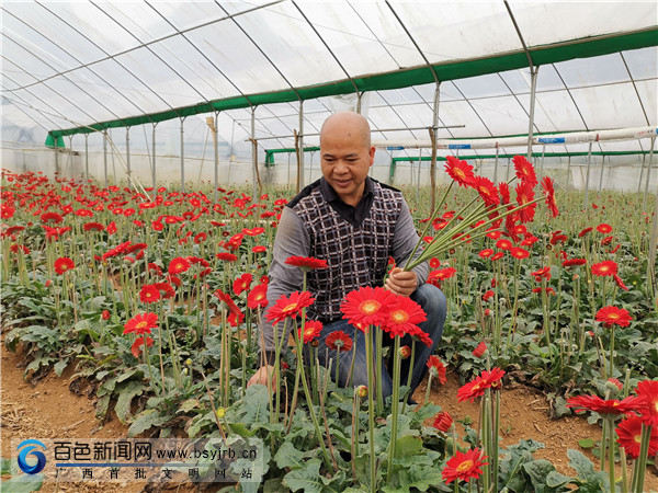 近年来,靖西市渠洋镇怀书村大力发展特色花卉产业,促农增收。通过“公司十基地十贫困户”模式种植20多亩非洲菊等鲜花,形成花卉观光、产销产业链,产品远销百色城区、南宁等。该村靠花卉产业种植既壮大村集体经济收入,又带动周边群众及在册建档立卡贫困户脱贫解困。图为3月30日,靖西市渠洋镇怀书村花卉种植基地内种植户在采摘非洲菊花准备出售。