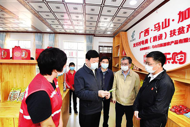 4月27日,自治区党委常委、市委书记王小东深入马山县开展脱贫攻坚调研。图为王小东在龙开村查看电商平台建设扶贫产业基地与农特产品集散中心给村民带来的增收情况。记者 陈麒元 摄