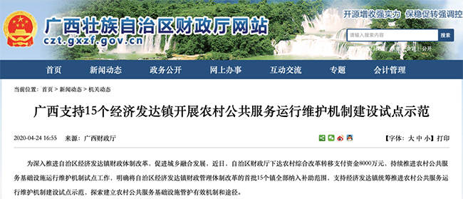 近日,自治区财政厅下达农村综合改革转移支付资金8000万元,持续推进农村公共服务基础设施运行维护机制试点工作,明确将自治区经济发达镇财政管理体制改革的首批15个镇全部纳入补助范围,支持经济发达镇统筹推进农村公共服务运行维护机制建设试点示范,探索建立农村公共服务基础设施管护有效机制和途径。