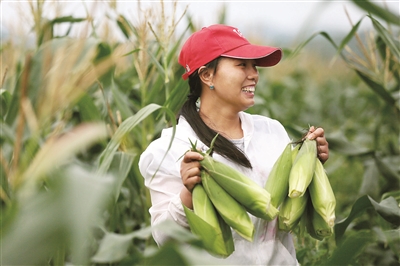 村民拿着丰收的糯玉米,心里喜滋滋。