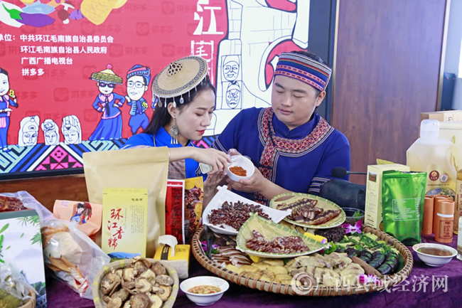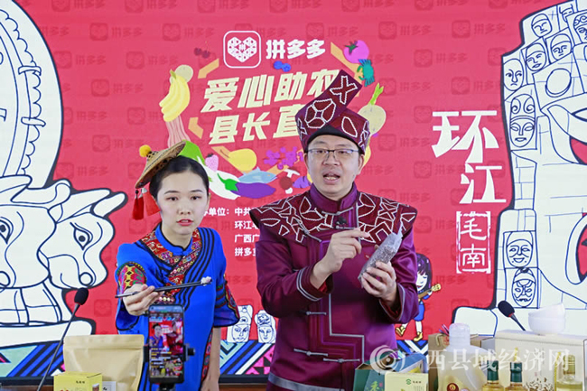6月6日,环江毛南族自治县人民政府县长黄炳峰穿着特色民族服饰走进直播间,向广大网友推介环江农特产品。
