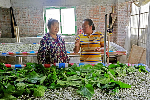韦玉香(右)上门指导群众桑蚕养殖技术 韦睿/摄
