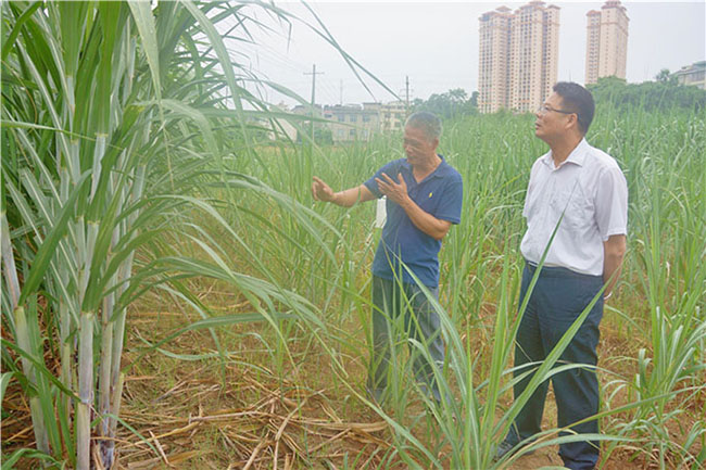 市委梁旭辉副书记在柳城县甘蔗研究中心实验田和卢文祥交流糖料蔗育种工作