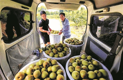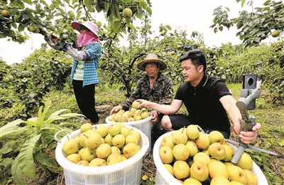 为了帮助村民找到市场销路,旗山村驻村第一书记和工作队员通过微信、广播电台等媒介发布水果供应信息,帮助村里的群众和贫困户拓展销售渠道,打开市场。最近几天,柳城县纳集盛电商商贸有限公司主动联系了驻村工作队员,派出员工驱车深入村屯,一边了解青花梨的种植情况和果品,一边用手机进行直播,或录制视频发布在微信群招揽更多潜在的客户。7月13日,该公司负责人再次进村联系果农,调出一批青花梨,通过“微信客户群+线下零售”的方式,仅一天时间就帮村里面的群众和贫困户出售青花梨800多公斤。目前,旗山村的青花梨已售出近5万公斤。