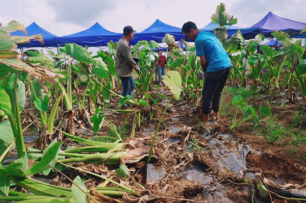 当天在该基地的田间地头,芋农们正热火朝天地忙着将挖出的香芋清泥、修剪、打包装袋,一片丰收的景象。