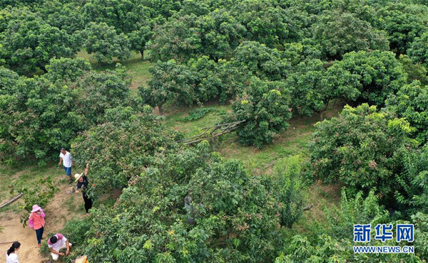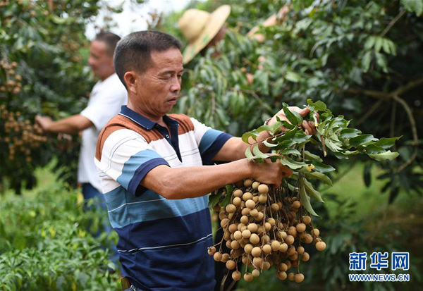 8月10日,在广西柳州市鱼峰区白沙镇新安村,村民在采摘龙眼。
