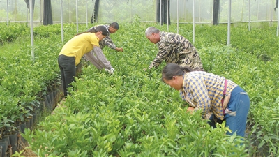 图为鹿寨进步农业科技有限公司柑橘无病毒苗木繁育基地工人正在护理鹿寨蜜橙和脆蜜金桔苗木。 本报通讯员 杨继强 摄