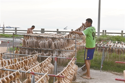 8月22日傍晚,地角渔民把晒场的“干货”收回仓库。