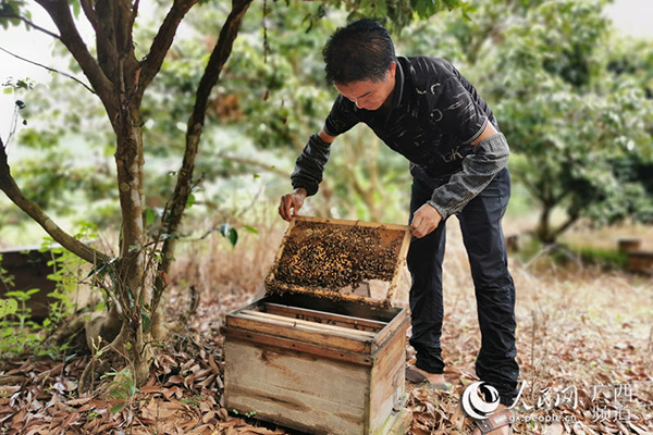 图为贫困户张其光在荔枝园检查蜂箱。覃春婷摄图为贫困户张其光在荔枝园检查蜂箱。覃春婷摄