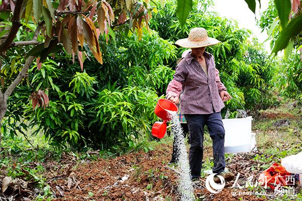 此外,示范区内的芒果管护、采摘、销售等生产流程中需要用工或示范区内的龙头企业、农民专业合作社工作运转需要用工的,优先聘用贫困户中的劳动力。近期,在示范区的芒果地里,西北乐村那班屯的贫困户杨秀远和其他村民忙着给果树放肥。今年6月起,他开始到示范区工作。“工作时间不固定,有需要就来干活,除草、修枝、松土、放肥等等。在这里我一个月能有一千块收入,这对于受疫情影响收入减少的我们来说帮助很大。”
