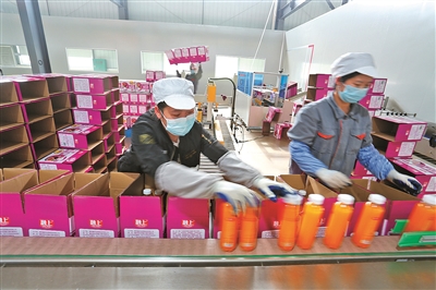 在融安金园食品有限公司,工人快速将一瓶瓶金桔汁装箱。