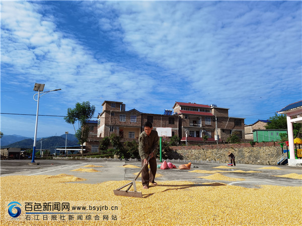 图为田林县八桂瑶族乡者达村建档立卡贫困户谭保胜在晾晒黄灿灿的玉米。