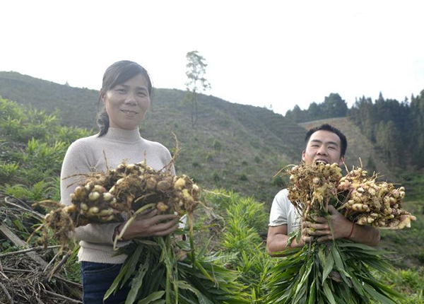 图为村民们正在展示采收的生姜。滚亿忠摄