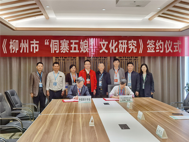 中国茶叶学会(江用文代表)与三江县文体广旅局(罗如芹代表)签订“侗寨五娘”文化研究协议