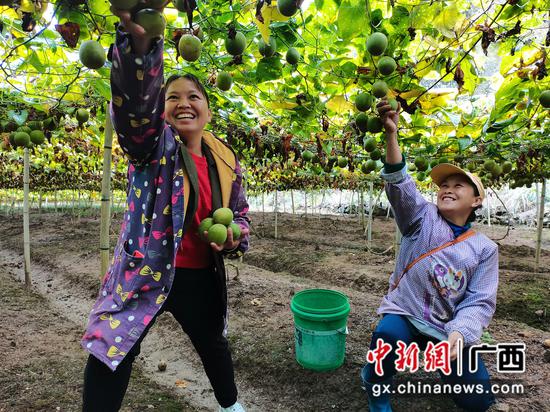 日前,在鹿寨县拉沟乡大坪村村民罗李英的罗汉果地里,放眼望去,成片的棚架下繁星般挂满了清香诱人的罗汉果,一派丰收的景象。罗李英一家正忙活着采摘罗汉果,脸上写满了丰收的喜悦。“我今年种了7亩罗汉果,一亩大概有1.5万个果,产值可以达到8000元一亩,效益还是比较好,比较可观的。”罗李英高兴地说。