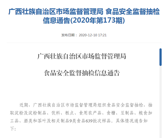 近期,广西壮族自治区市场监督管理局组织食品安全监督抽检,抽检食用农产品138批次、检出2批次不合格样品,抽检淀粉及淀粉制品30批次、检出3批次不合格样品,抽检糕点97批次、检出2批次不合格样品,抽检食糖59批次、检出4批次不合格样品,抽检饮料92批次、检出1批次不合格样品;茶叶及相关制品81批次、豆制品69批次、酒类16批次、粮食加工品57批次,均未检出不合格样品。