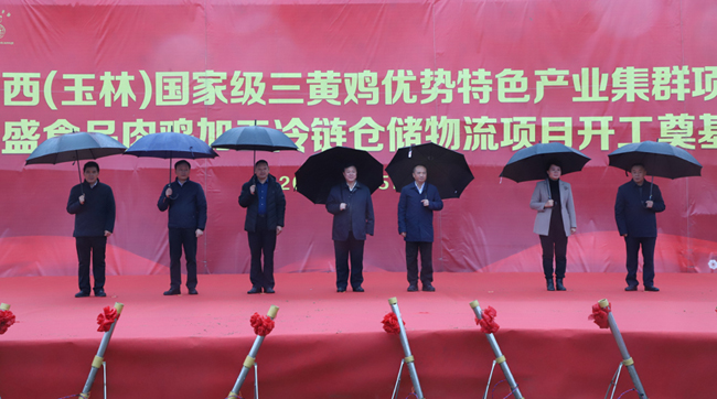 12月15日上午8:50在玉州区广西长盛食品有限公司食品肉鸡加工冷链仓储物流基地玉林市人民政府举办2020年广西(玉林)国家级三黄鸡优势特色产业集群项目启动暨广西长盛食品肉鸡加工冷链仓储物流项目开工奠基仪式。
