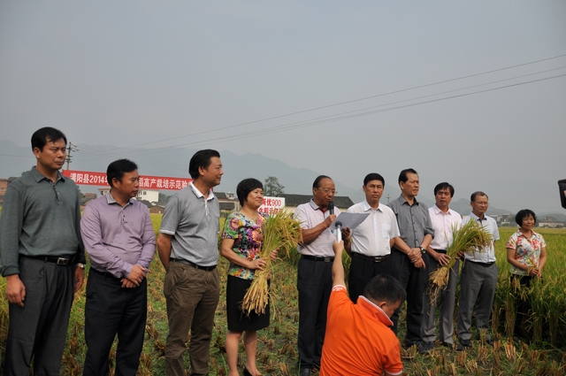 灌阳县千亩再生稻高产栽培示范片位于黄关镇联德村,示范面积1200亩,是2010年建立起来的超级稻高产攻关示范基地,也是袁隆平院士2012年启动的超级稻第四期高产攻关项目在广西安排的计划五年内实现亩产1000公斤攻关目标的三个攻关示范基地之一。该基地头季稻品种以Y两优900、Y两优2号、湘两优2号为主,播种期为3月22日至24日,收割期为8月13日至23日。示范基地建立以来,当年就实现最高亩产813.3公斤,2012年首次突破900公斤大关,2014年实现最高亩产961.3公斤。